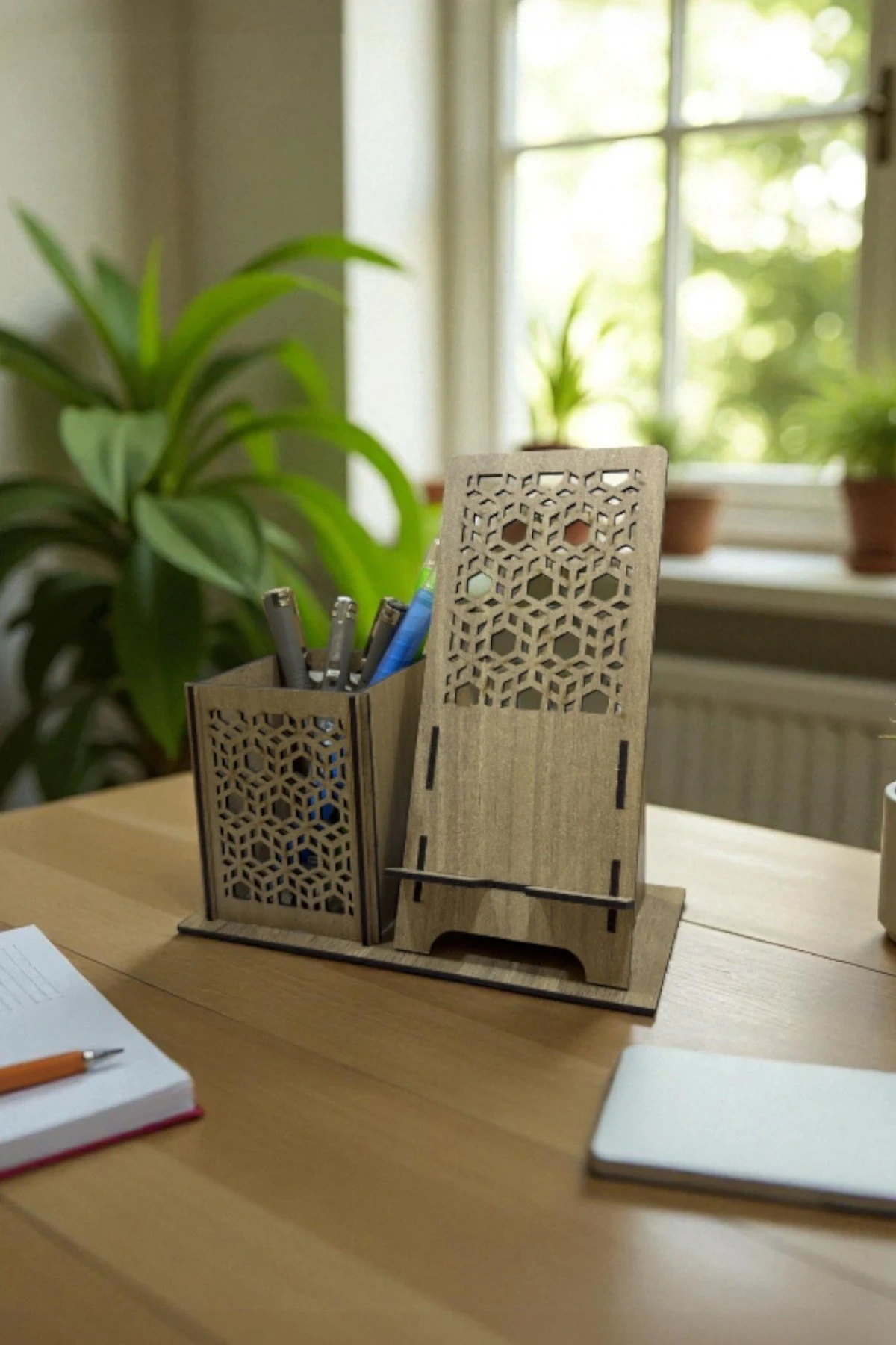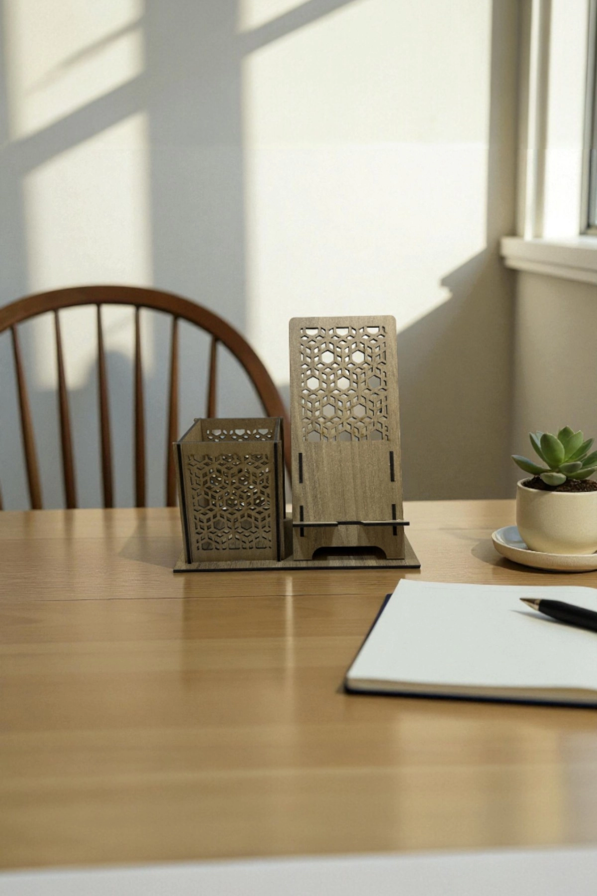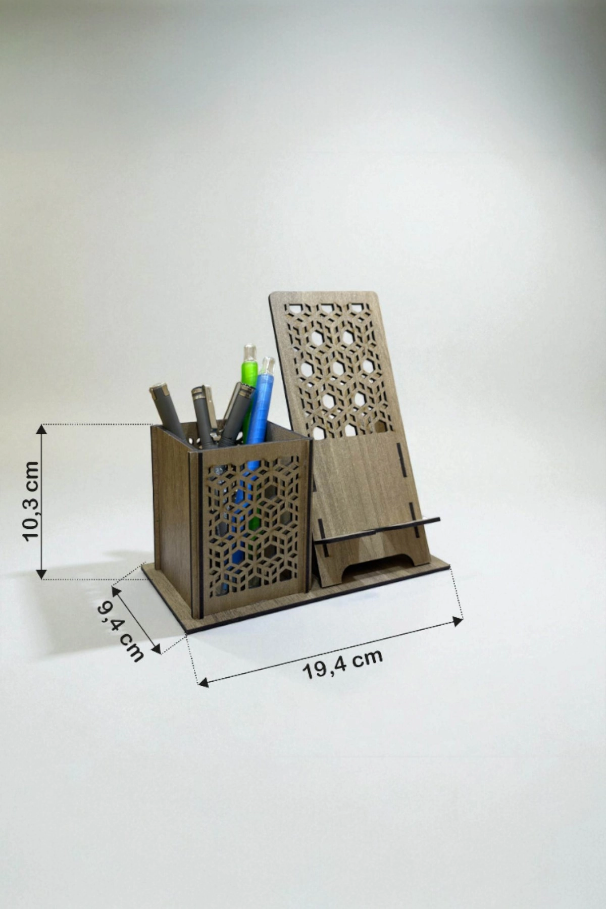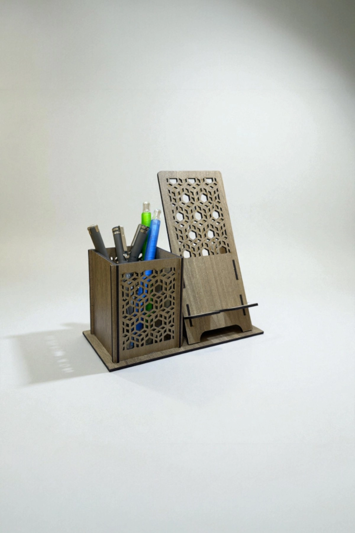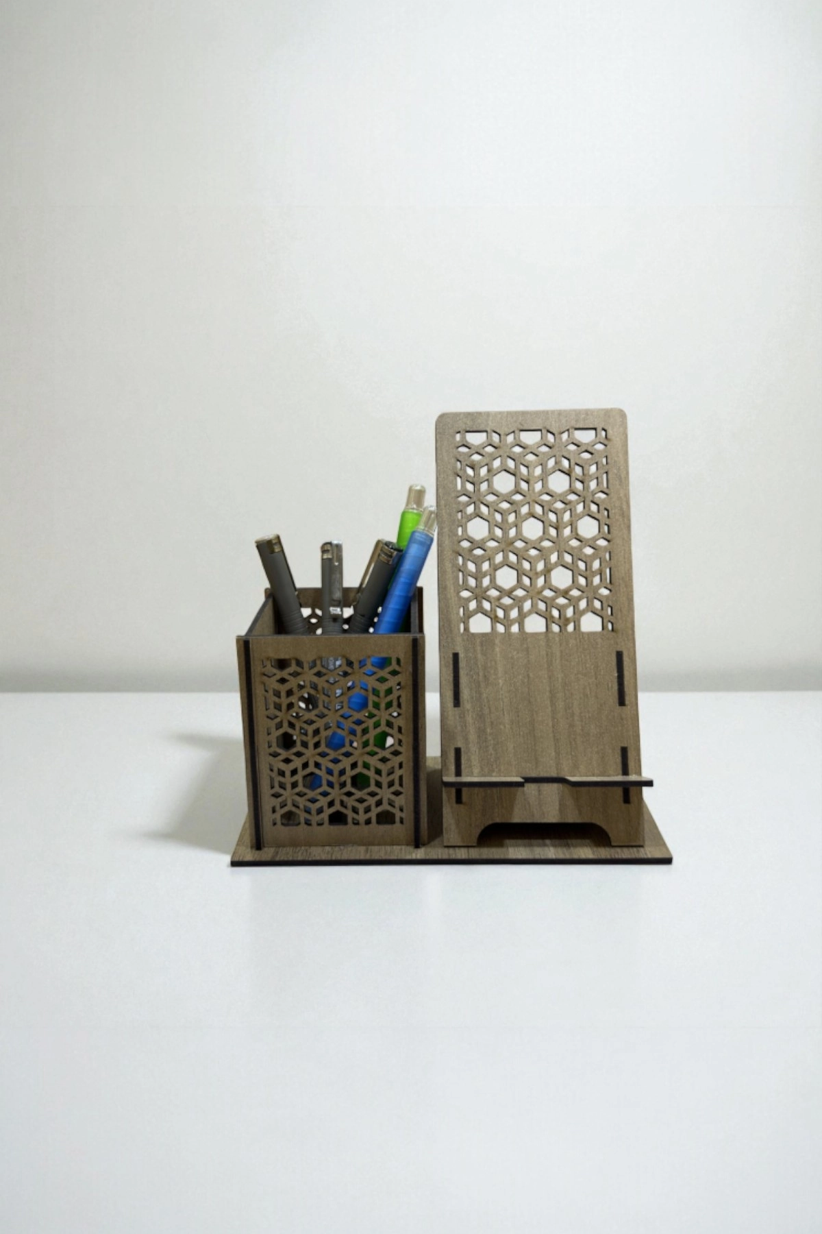 Kalemlik & Telefon Standı – Geometrik Desenli – Ceviz Kahve (Koyu Ahşap); doğal ceviz tonunun sıcaklığıyla geometrik kübik/petek kesim motifleri bir araya getirerek hem dekoratif hem de kullanışlı bir masaüstü düzenleyici sunar.