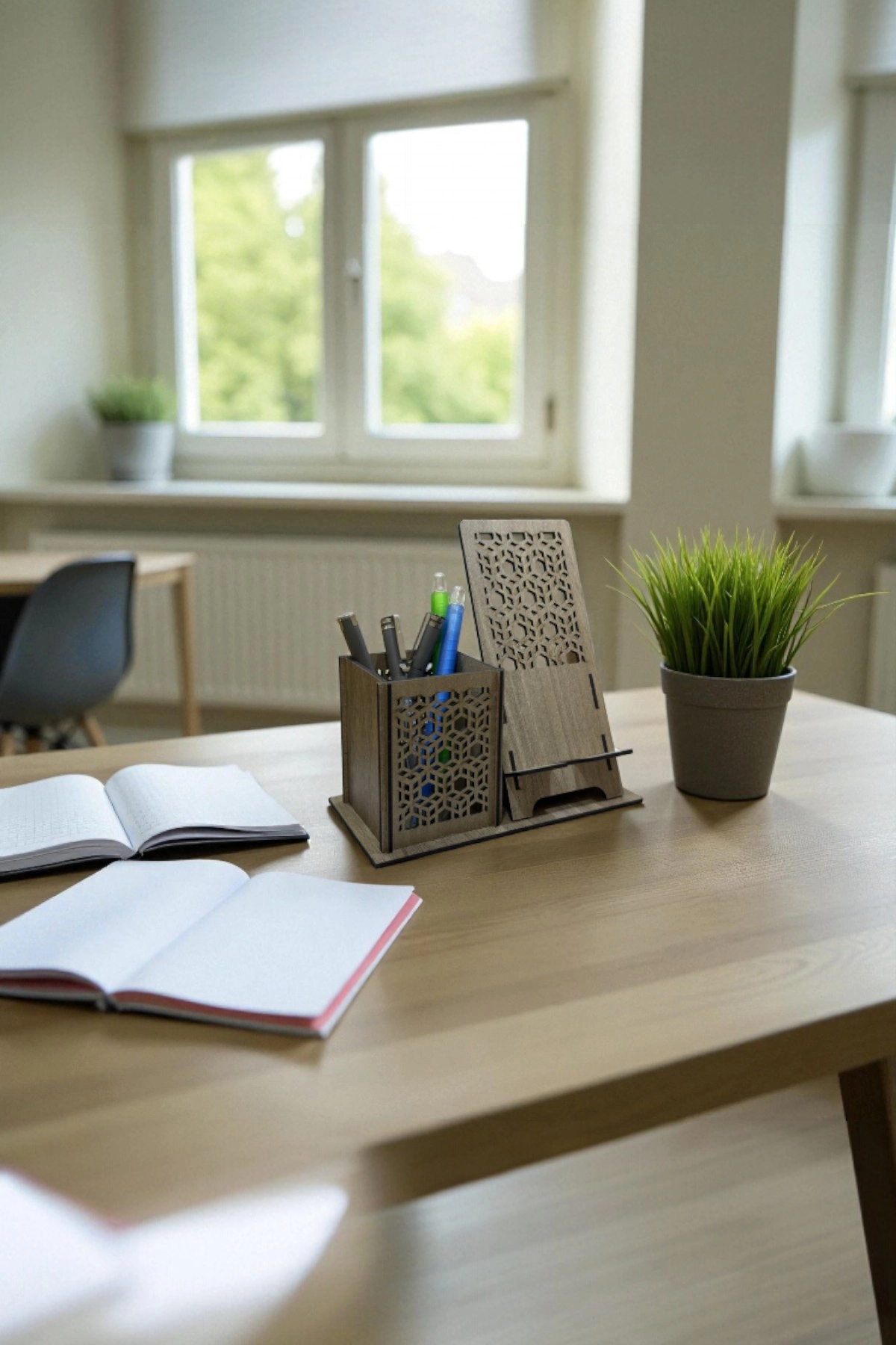 Kalemlik bölümü; kalem, makas, marker ve günlük ofis malzemelerini kolayca toplarken, telefon standı tüm telefon modelleri için uygun açıya sahiptir ve videolu içerik izleme, bildirim takibi veya ders çalışma sırasında rahat kullanım sağlar.